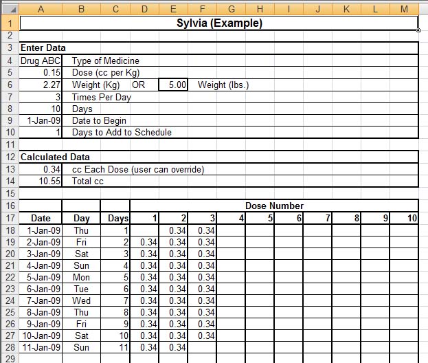 Get Medicine Spreadsheet here. Calculates medicine dosage, given the weight of the rabbit. Creates chart with all doses required for the duration of the treatment.