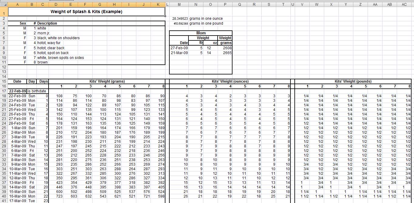Get Weight Spreadsheet here. Records the daily weights of baby rabbits. Grams are converted to ounces & also to pounds. Values can be plotted.